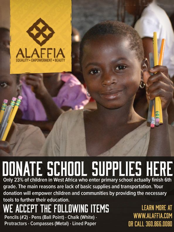 Please bring any donations to the Wellness desk in either of our store locations. With your support, Alaffia will be able to provide thousands of students with much needed school supplies.