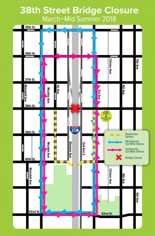Construction season is upon us in Minnesota, and this year the Bryant-Central neighborhoods are no exception. In March, the 38th Street Bridge closed and is scheduled to reopen mid summer 2018. We’ve provided detour routes for bicycles and cars below. We aren’t letting a little construction get us down, and neither should you—take the scenic route and check out the great locally-grown foods Seward Co-op has to offer!