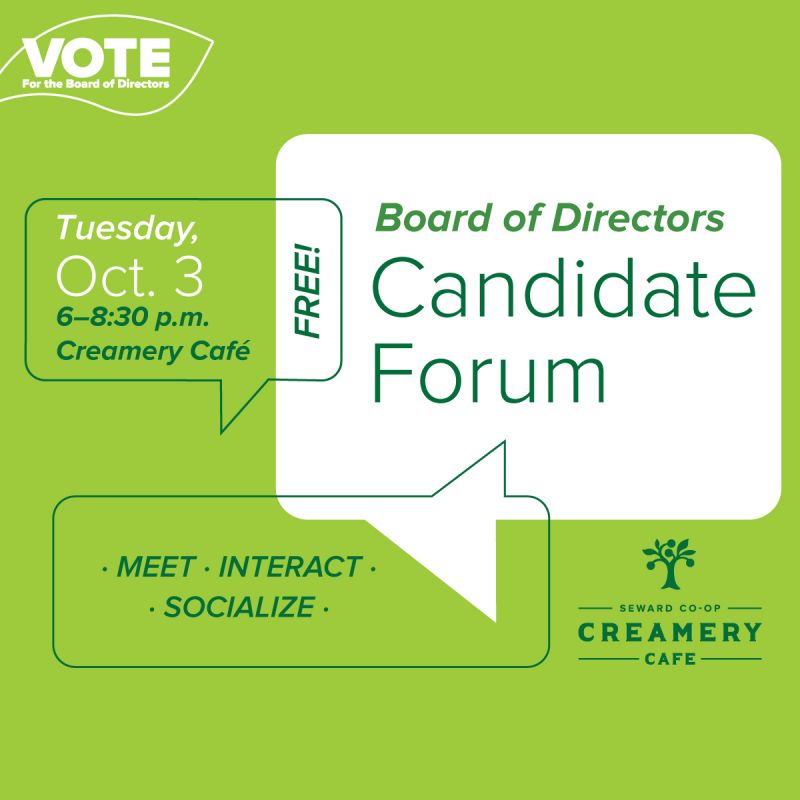 Seward Co-op’s Board of Directors will host a Candidate Forum as part of the 2017 election. We will gather in the Creamery Café to hear from and meet the candidates, and to visit with fellow co-op owners. LaDonna Sanders-Redmond, Diversity and Community Engagement Manager, will facilitate the large group portion of the evening and we’ll also have some time for informal conversation. In past years, voters have told the board that written essays alone make it difficult to distinguish candidates. We hope the forum will encourage dialogue about governing our cooperative. What questions might you ask of co-op board candidates?!