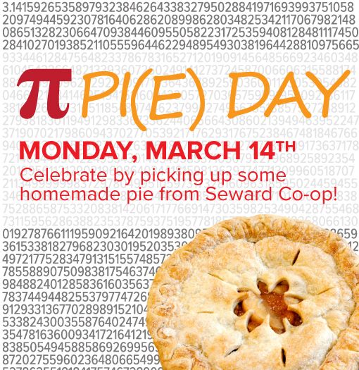 Pi(e) Day is Monday, March 14! Celebrate by picking up some homemade pie from Seward Co-op. We have whole pies and pies by-the-slice available in a wide range of flavors— key lime, French silk, and raspberry, just to name a few. Whole key lime pies are on special for $21.49 or $3.49/slice. Our pie is handmade by our bakers with the freshest ingredients possible, so be sure to stop in and get a taste.