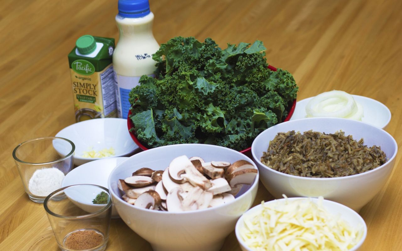 Sprinkle the flour over the kale and mushrooms and cook for one minute. Add the milk and broth, bring to a boil, and cook two–three minutes or until there is a thick sauce. Add the cream and stir to combine. Remove from the heat and stir in the cooked wild rice. Pour the mixture into the prepared casserole dish.