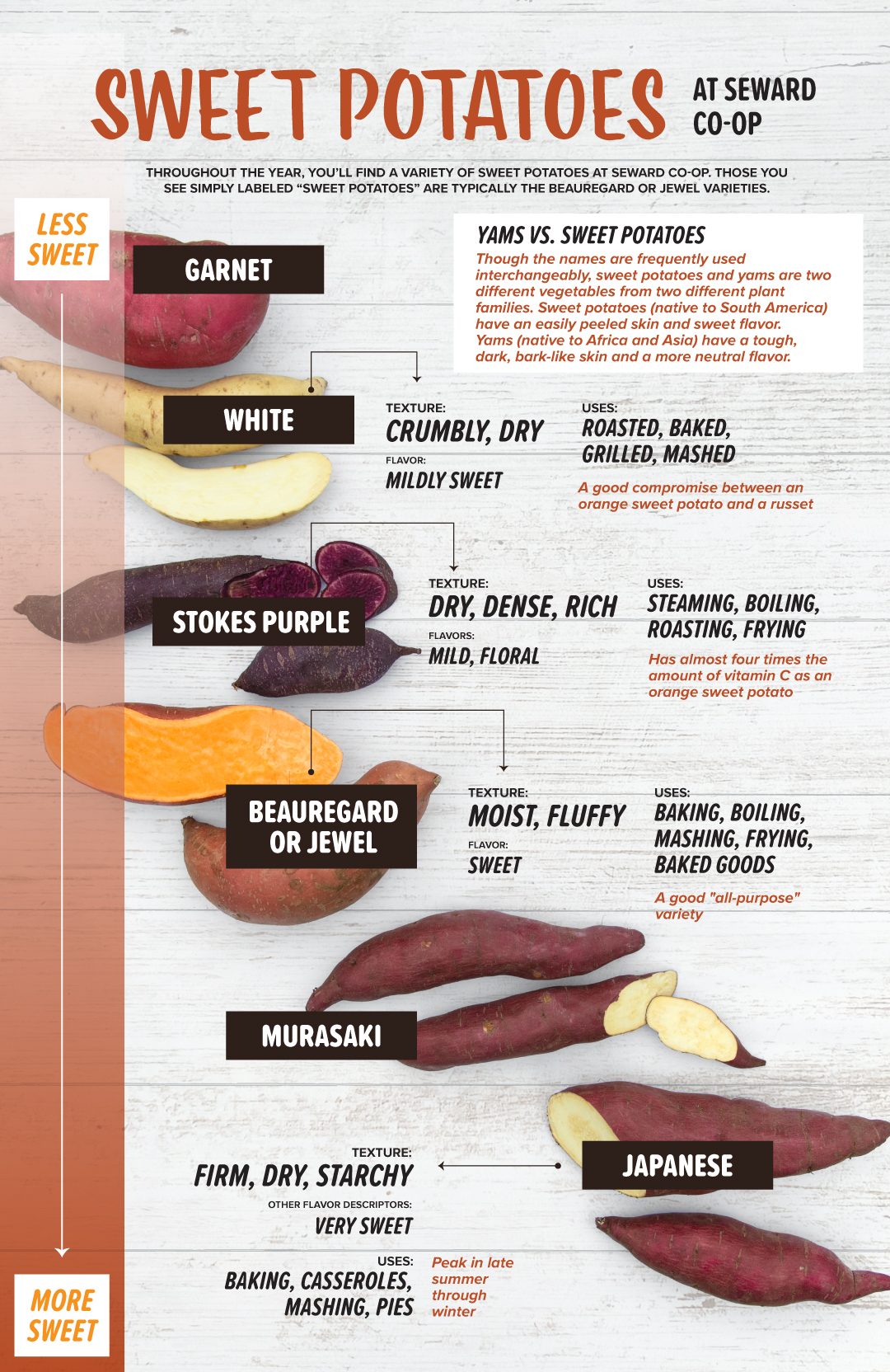 Get ready for fall flavors on Seward Co-op shelves! Few things are cozier than mashed potatoes, gravy, and hot baked apple pies. Humble white or yellow potatoes often steal the spotlight, but warm, autumnal flavors sometimes have us reaching for their cousin, the sweet potato, or their other cousin, yams. Confused about your tubers? Let us help you out with an introduction, along with a few ideas on how to use them.