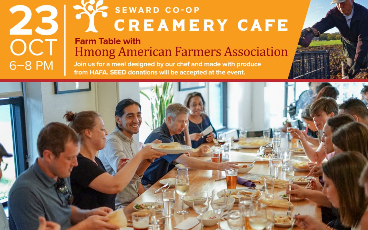 Join us for a meal designed by Creamery Café executive chef Matt Kappra and made with produce from our October SEED grant recipient, the Hmong American Farmers Association, on Oct. 23, 6-8 p.m., at Seward Co-op Creamery Café. SEED donations will be accepted at the dinner.