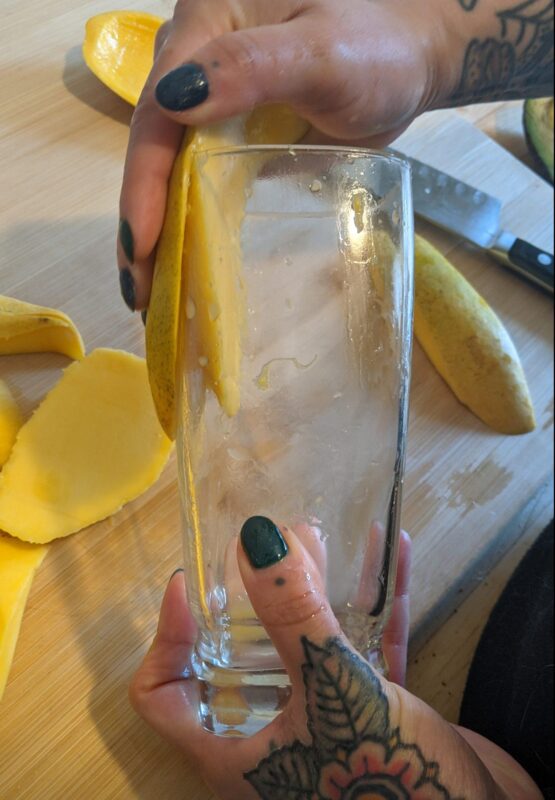 We’ve found one of the best ways to take the flesh off the large inner seed of the mango is using a thin-walled cup and a knife.