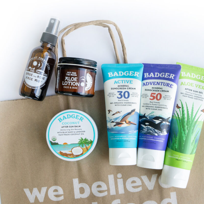 Be kind to your skin with sun essentials like sunscreen from Badger and Fat and the Moon’s aloe lotion for after a day in the park.