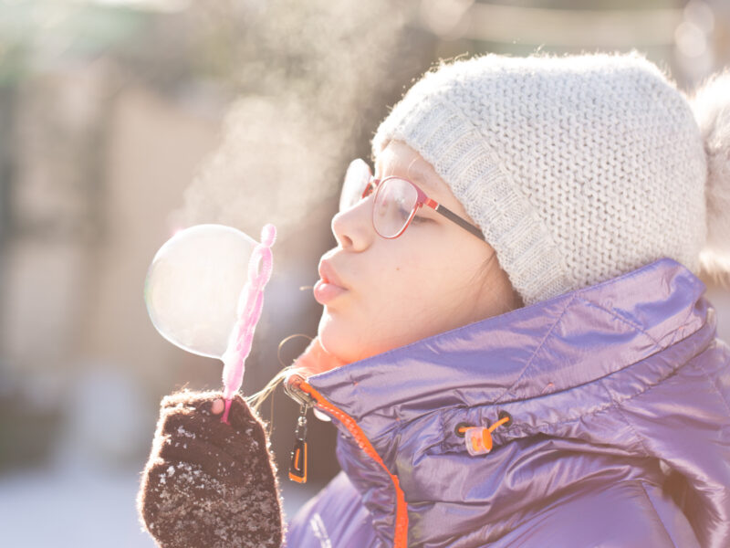 When it’s freezing outside, you can turn simple bubbles into sparkly snow globes in the air. If it’s cold enough, the soap mixture traps water vapor as it freezes into delicate ice patterns before the bubble pops!