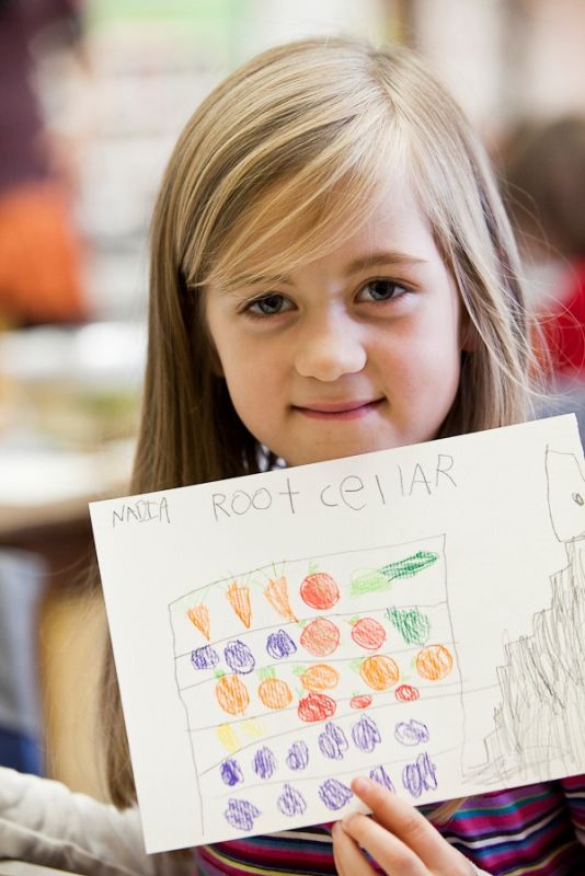 I am consistently impressed by the number of “thumbs up” I see when we vote with our thumbs, especially when tasting more grown-up foods like our winter vegetable stew with leeks, kale, and rutabaga — three vegetables that on their own might be met with strange looks from a class of kindergarteners, if not outright shows of skepticism or distaste. It might help that, as part of our lesson on winter vegetables, the kindergarteners have been transported to another time… 100 years ago, when most people didn’t have refrigerators in their homes and stored much of their harvest in their root cellars. Kindergarteners take turns pantomiming walking down the stairs to the root cellar to fetch vegetables for our stew, and the anticipation of eating builds as I finish cooking, posing as an old-fashioned mom making lunch for her kids.