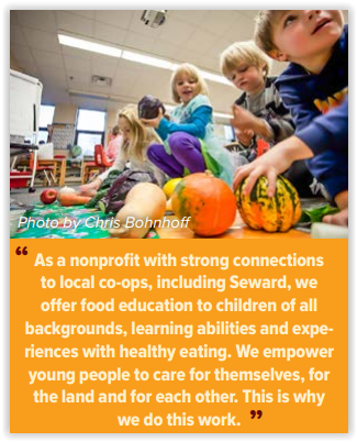 By learning about and plugging into a local food system, MFC students become connected to the greater Minnesota community. Whether tasting a Honeycrisp apple in class, going to the co-op with their families, seeing pictures of local farmers, visiting farms around the Twin Cities during our field trips, or starting to grow food in their own neighborhoods, young people connect the dots of the food system. As one of our educators remarked, we bring the “human aspect” to food. We say, “think about the farmer who grew the food you’re about to taste.” When kids learn about the support we give to farmers in our state or the sustainability of our collective actions, they begin to uphold one of the seven national Photo by Susie Hessburg co-op principles: Concern for Community.