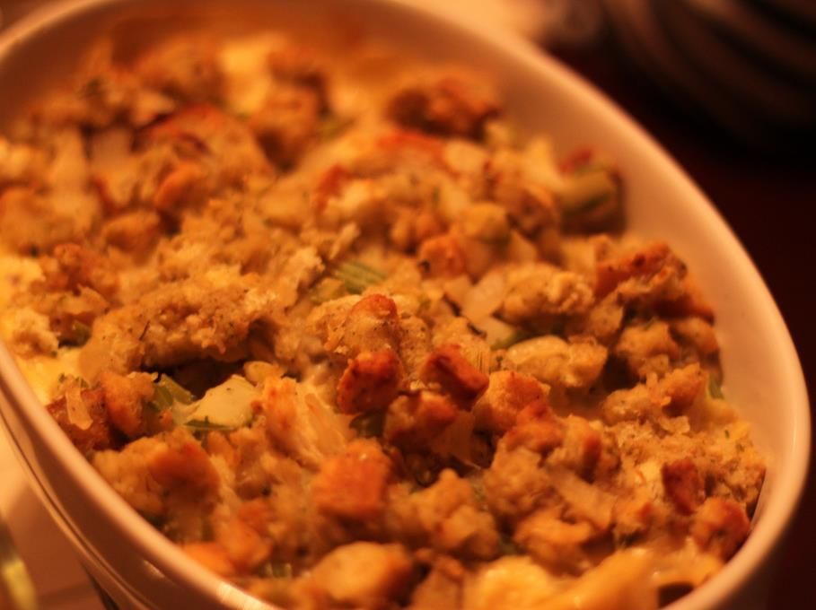 For a chestnut stuffing, either roast or boil 1 pound of chestnuts before removing the shell and inner skin. Then simmer in 2 cups of vegetable broth for 20 minutes. Remove from heat and stir in 1 cup of dried cranberries – let sit for 5 minutes. In a large saucepan, brown wedges of two large onions. In a large bowl combine the chestnut mixture with 10 cups cubed dry or toasted whole grain bread, the browned onions, chopped parsley, thyme, and sage. Add 1 ½ cups of broth and salt and pepper. Bake in a shallow baking dish at 325 degrees F for 45 minutes.