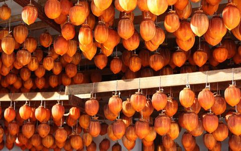 In Japan, they are available fresh as I found them but the astringent varieties are also hung to dry for weeks to become the delicacy known as hoshigaki. The under ripe persimmons are peeled, dunked in boiling water or alcohol to disinfect the surface and then are hung on cords for several weeks. In Japanese homes and shops, the strings of persimmons are hung outside from the eaves of buildings (see below). Here they could be hung inside in a sunny window to protect from frost and squirrels. After a few days of hanging, the persimmons are gently kneaded or massaged every other day. After a few weeks, the sugars will rise to the surface of the fruit as a white, powdery finish. In 4-6 weeks, the persimmons should be shriveled with a chewy texture and a sweetness comparable to dates – a treat well worth the wait and effort.