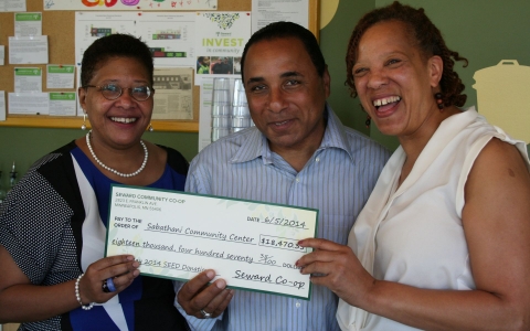 June 5, 2014 –Reps from Sabathani Community Center Food Shelf received their record-breaking SEED check from Seward Co-op in a small but very moving ceremony today. Seward owners and shoppers gave more money in the monthly register donation program’s history at $18,470.