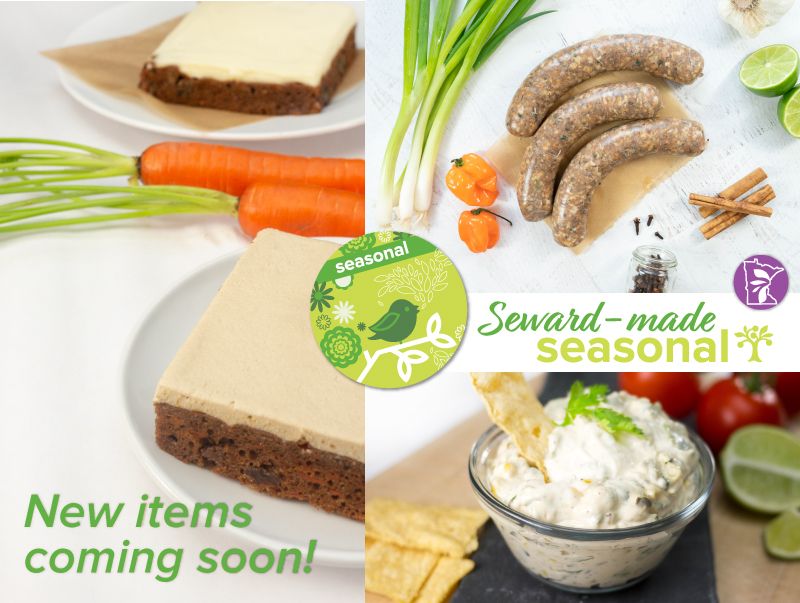 Seward Co-op’s production kitchen is cranking out salads, entrees, dips, sausages and desserts for spring. Here are some highlights of what you’ll find:
