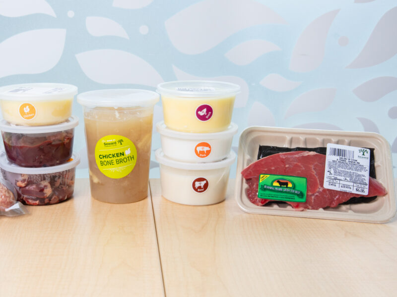 In the Meat and Seafood department, whole animal butchery is the name of the game. This means almost every part of the animal is used, which both prevents food waste and allows for harder-to-find cuts to be available. From house-rendered lard to sausage trimmings and more, Seward Co-op staff are trained to utilize the entire carcass, with the few unusable parts composted. If the department has more meat from a carcass than they anticipate can be sold, the cuts are ground and sent to the Deli while still fresh for use in various Seward-made recipes. Similarly, when Produce has more ripe bananas and avocados than they except to sell, the excess is frozen and used for smoothies at the drink counter.